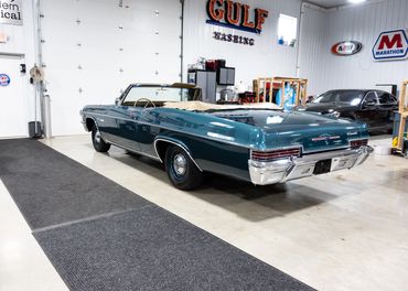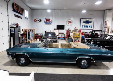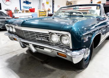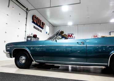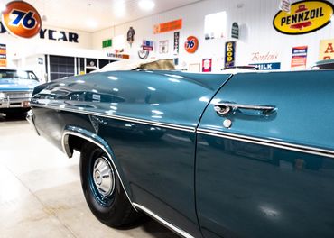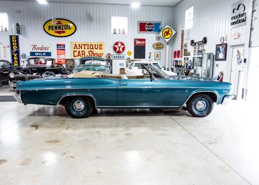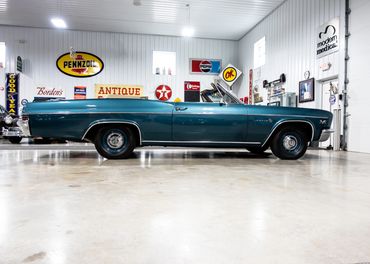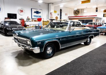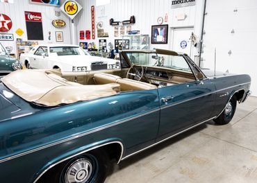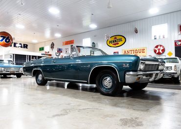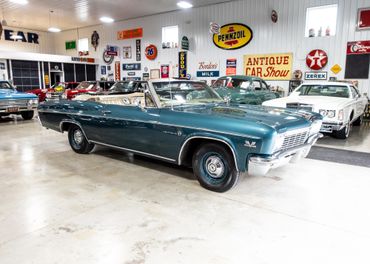 ShineSnapSell.com is excited to bring you this 1966 Impala convertible. This beauty comes with a monster 427 cid engine paired with a 400 Turbo Hydramatic transmission. Only a handful of 427 Impalas were made in 1966 and clearly this Impala was loved and pampered it's entire life. The interior is a beautiful golden color that looks great with the turquoise exterior. This car runs as good as it looks with a ton of acceleration and power!