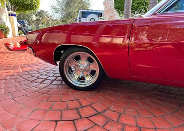 This Charger R/T features disc brakes all the way around, giving you maximum stopping power whenever you need it. It sits on a staggered setup with Cragar wheels and wider tires out back, giving it a bold and unmistakable look. The car is finished in striking red paint with a sleek black interior, making it a true head-turner.